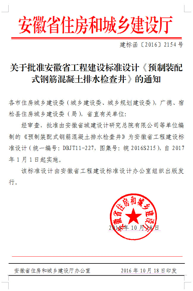 關(guān)于批準(zhǔn)安徽省工程建設(shè)標(biāo)準(zhǔn)設(shè)計《預(yù)制裝配式鋼筋混凝土排水檢查井》的通知