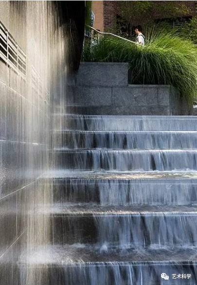 跌水是指規(guī)則形態(tài)的落水景觀,多與此同時建筑、景墻、擋土墻等結(jié)合,跌水表現(xiàn)了水的墜落之美。