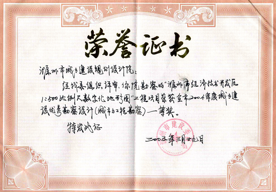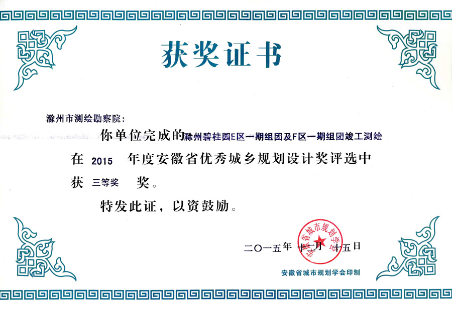 滁州市經(jīng)開區(qū)地形圖測繪規(guī)劃獲獎證書
