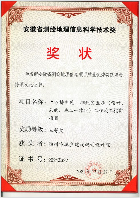 安徽省測繪地理信息科學(xué)技術(shù)獎三等獎